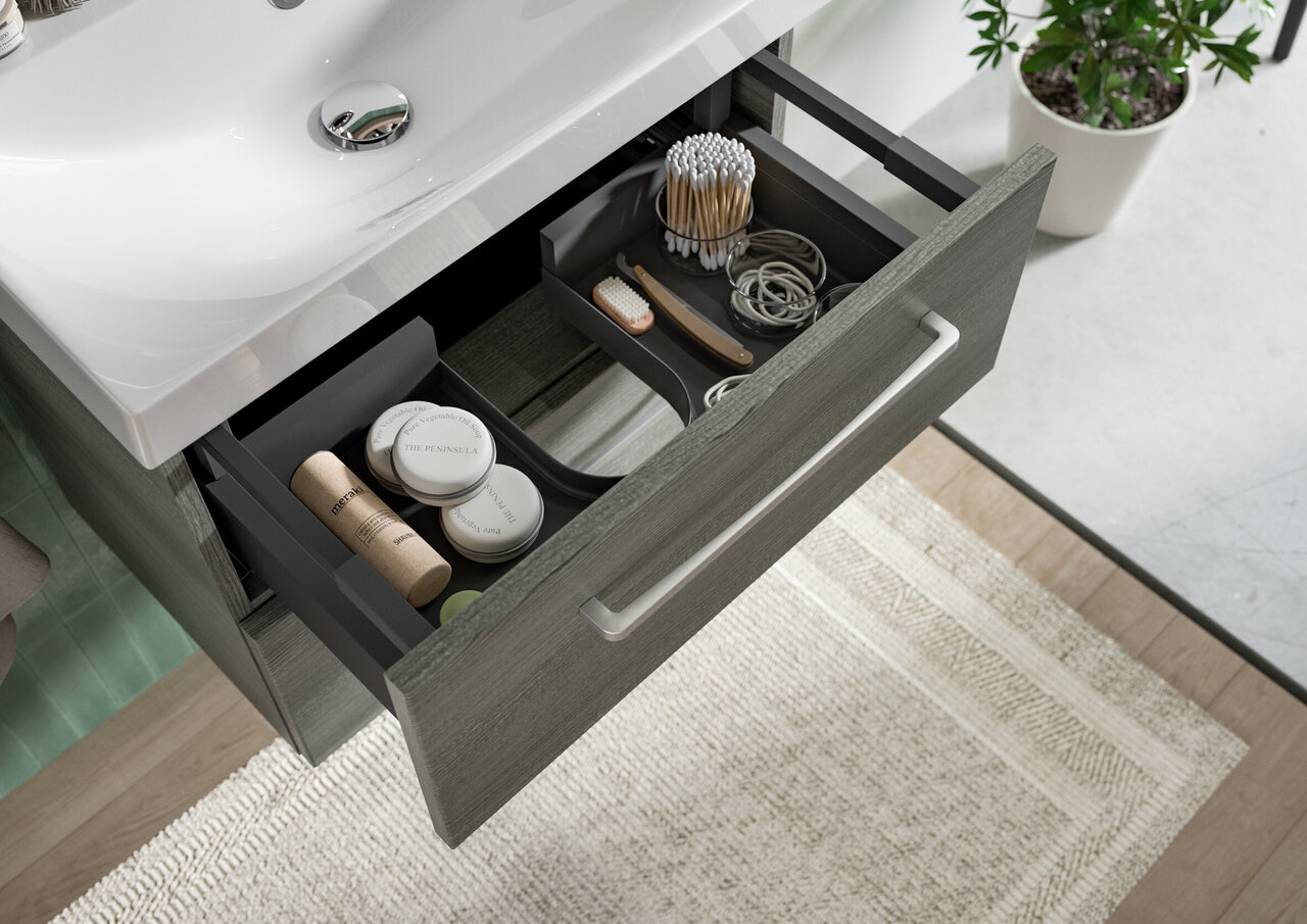 Als Raumwunder präsentiert Pelipal SERIE 6910. Mit Waschplätzen in verschiedenen Größen findet sich für jede Räumlichkeit eine moderne, intelligente Lösung. Vor allem die Modelle mit reduzierter Tiefe bieten ganz neue Möglichkeiten der Gestaltung, die gerade in den häufig beengten Altbaubädern gefragt sind. Das geradlinige Design wirkt elegant und kann durch diverse Front- und Korpusdekore von klassischem Weiß über warmes Eiche Ribbeck bis hin zu Baltic Blau Matt dem individuellen Stilempfinden angepasst werden. Hochqualitative Waschtische aus Mineralmarmor, Keramik oder Krion runden das Ensemble ab.