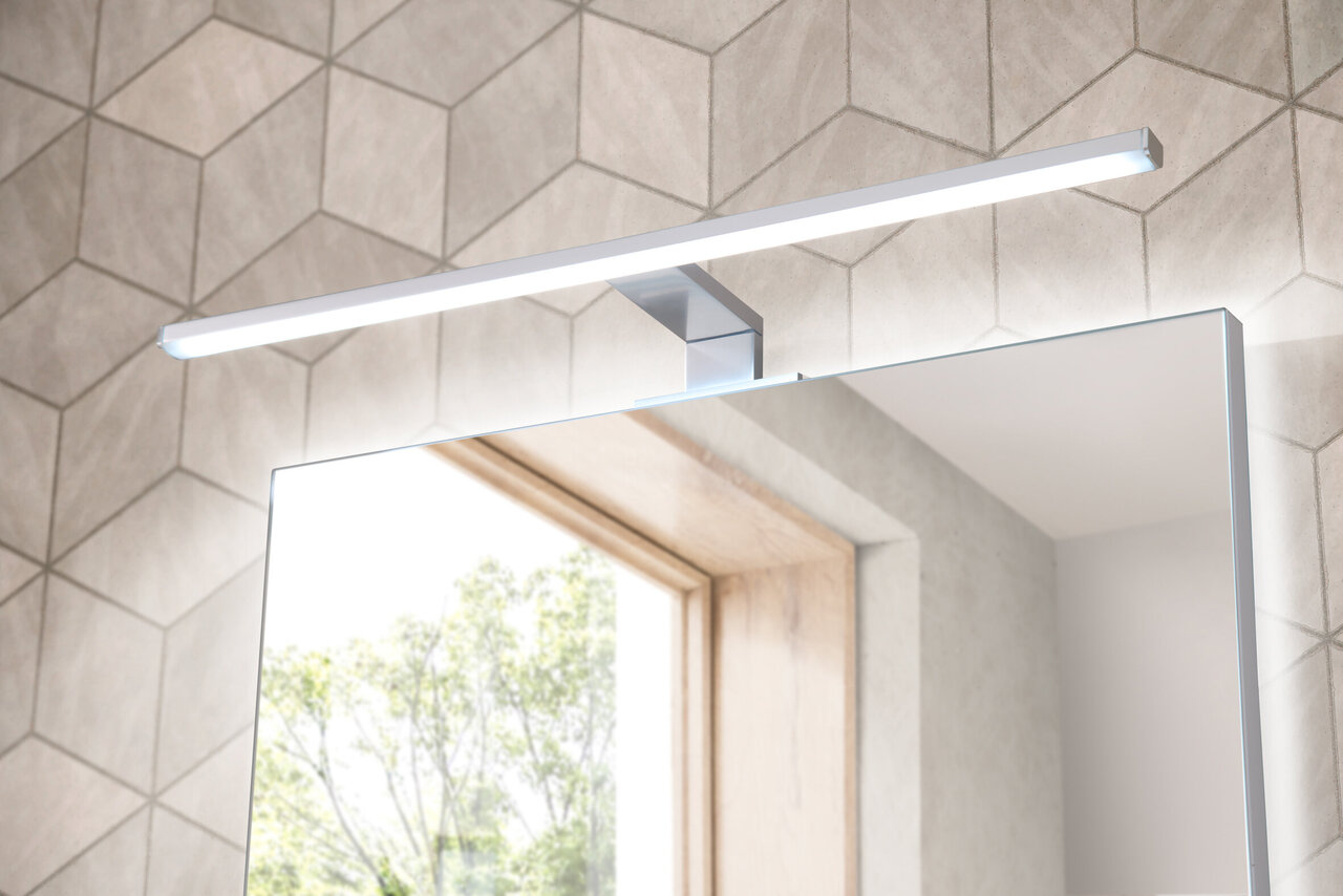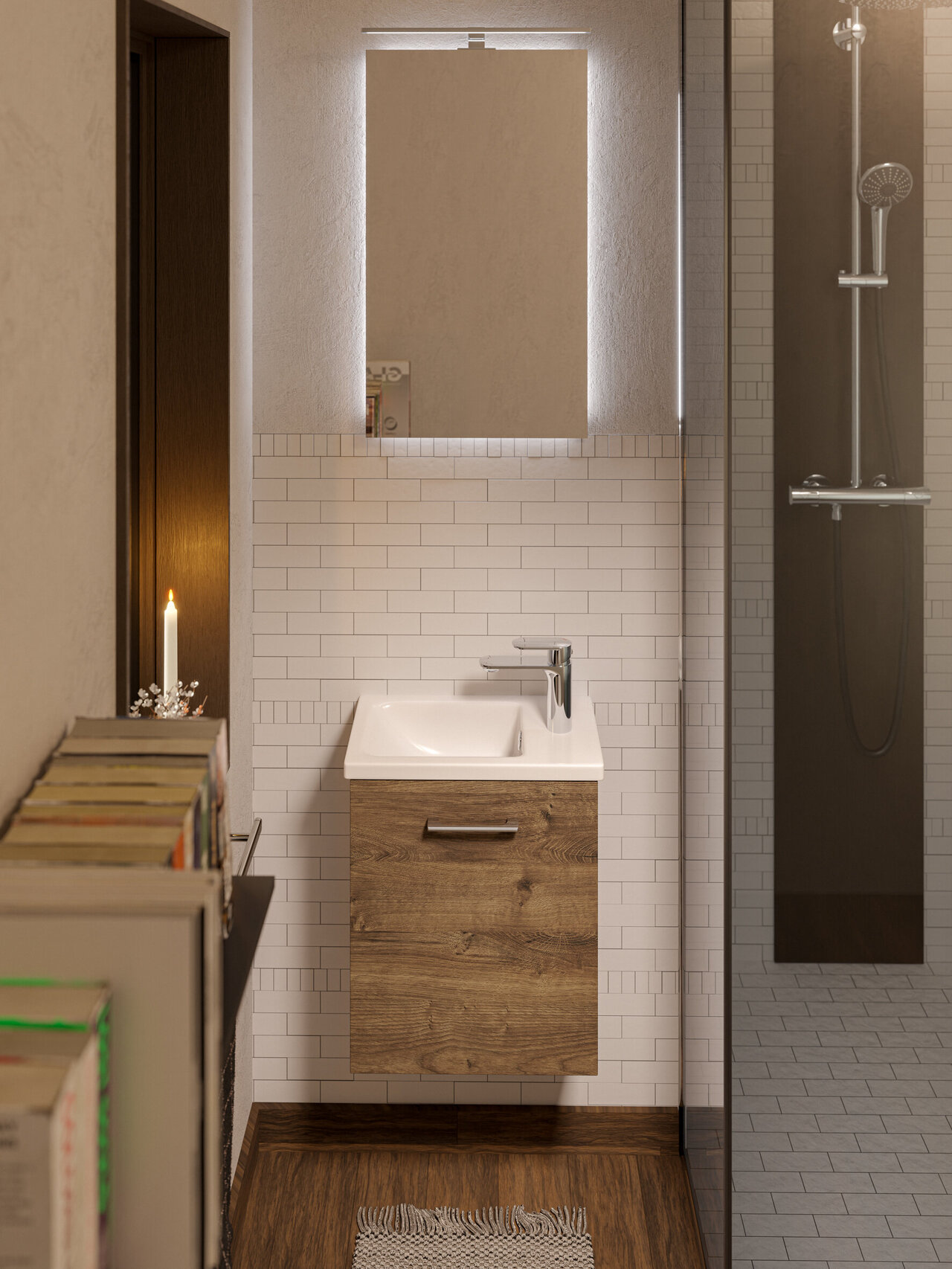 Front- und Korpusdekor Eiche Ribbeck quer NB, Waschplatz 420 mm Breit, Keramikwaschtisch weiß, Waschtischunterschrank mit 1 Drehtür, Funktionsspiegel auf Trägerplatte inkl. LED-Effektlicht