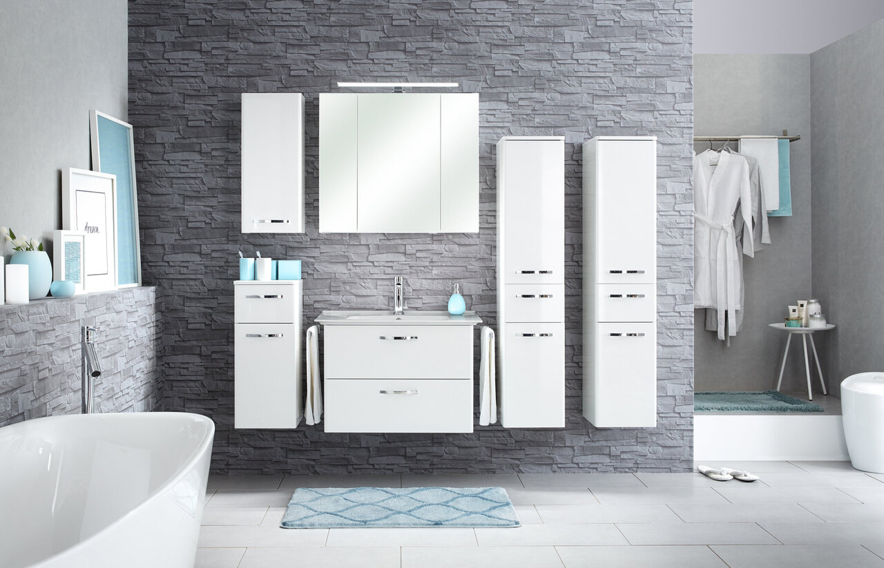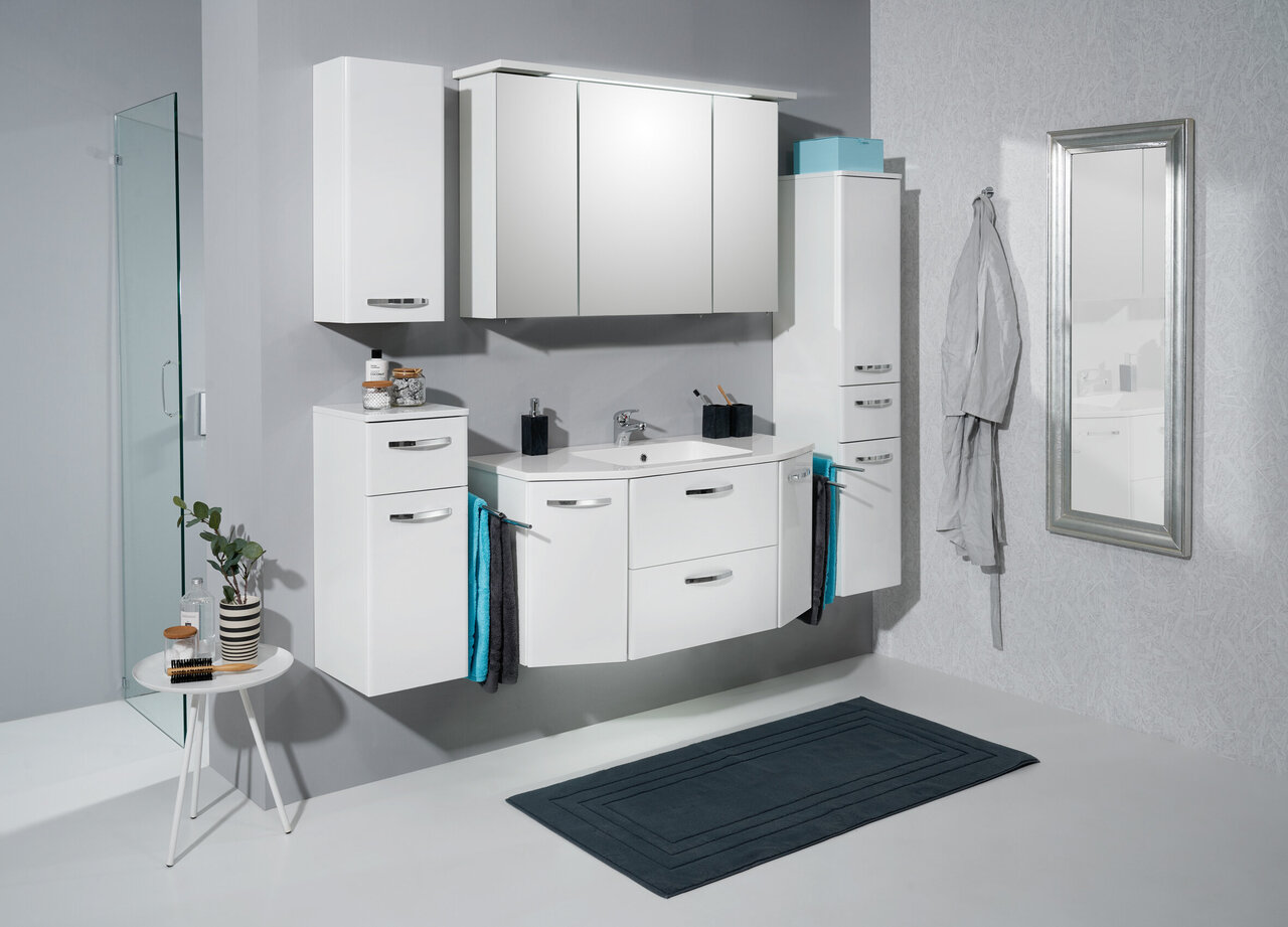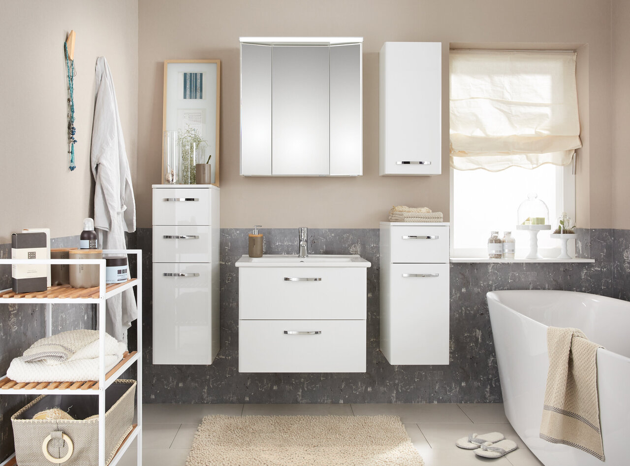 Frontdekor in Weiß Hochglanz, Korpusdekor in Weiß Glanz, Waschbeckenunterschrank, Griff Chrom Glanz, Spiegelschrank mit Schalter/Steckdose inkl. LED-Aufsatzleuchte, Montage wandhängend oder auf Fuß-Set