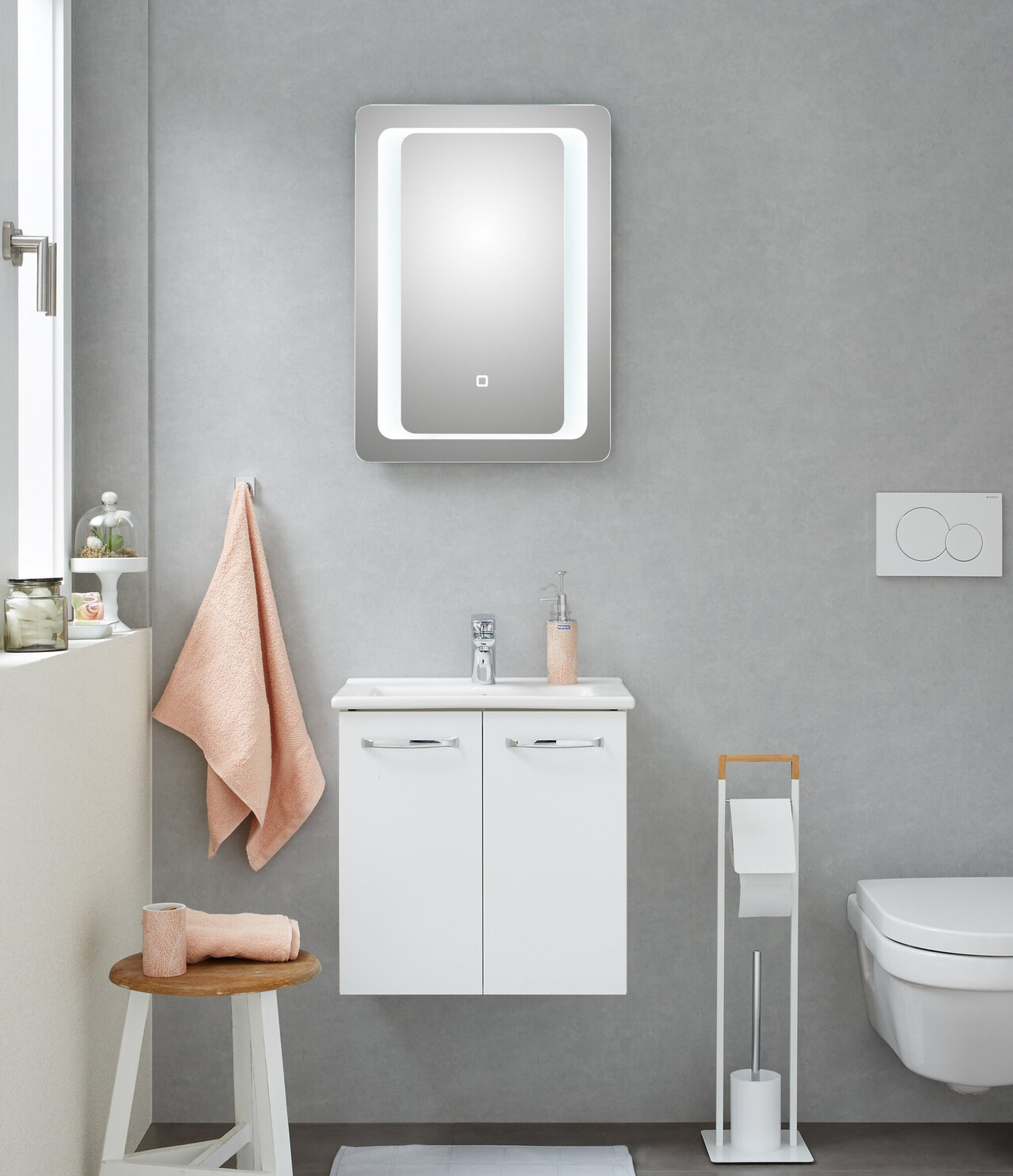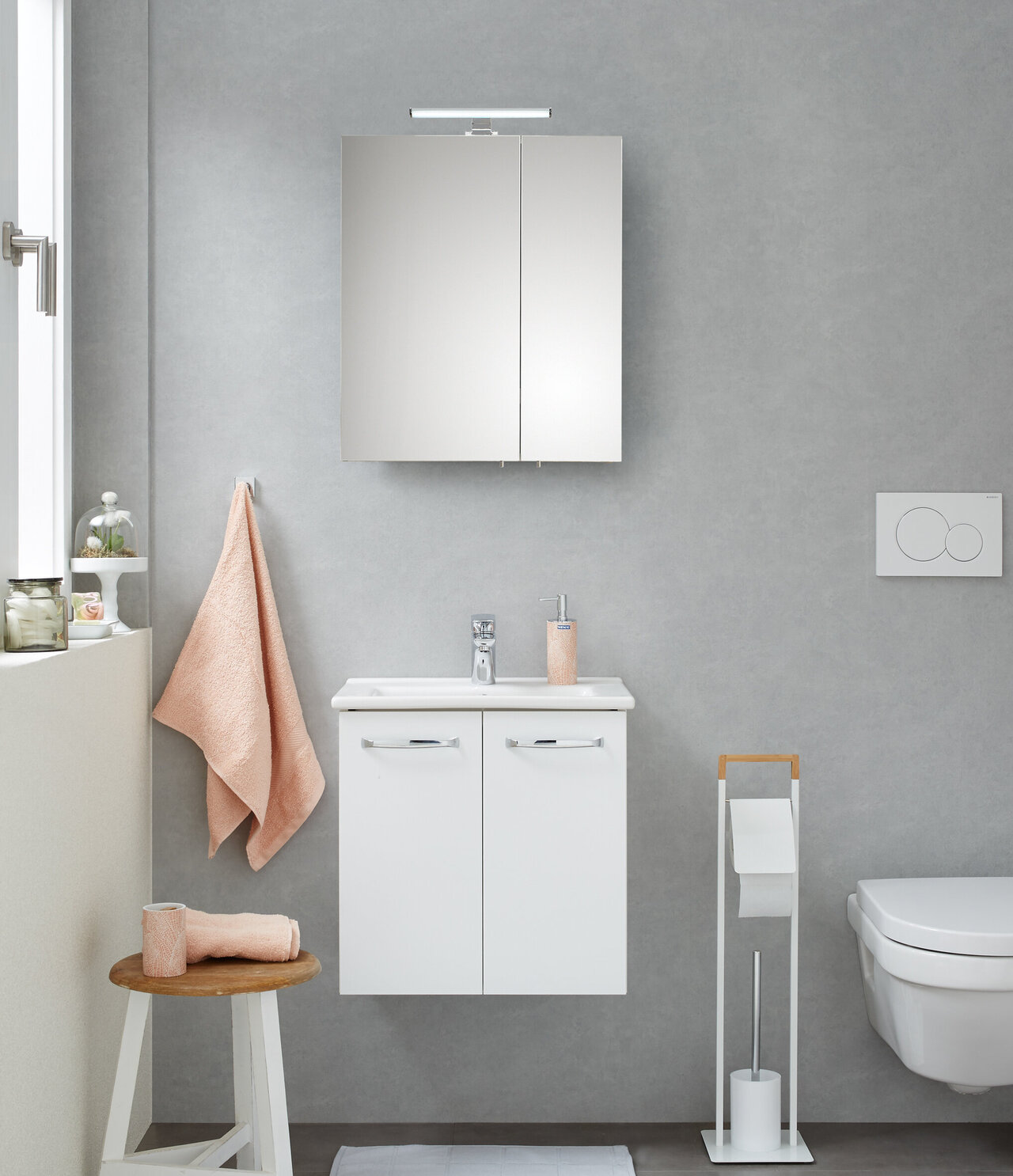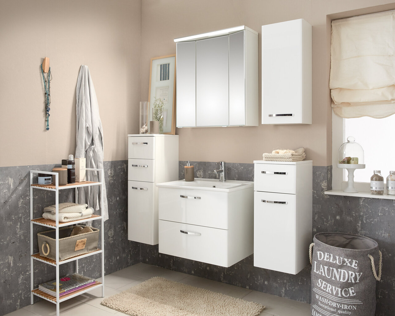 Frontdekor in Weiß Hochglanz, Korpusdekor in Weiß Glanz, Waschbeckenunterschrank, Griff Chrom Glanz, Spiegelschrank mit Schalter/Steckdose inkl. LED-Aufsatzleuchte, Montage wandhängend oder auf Fuß-Set
