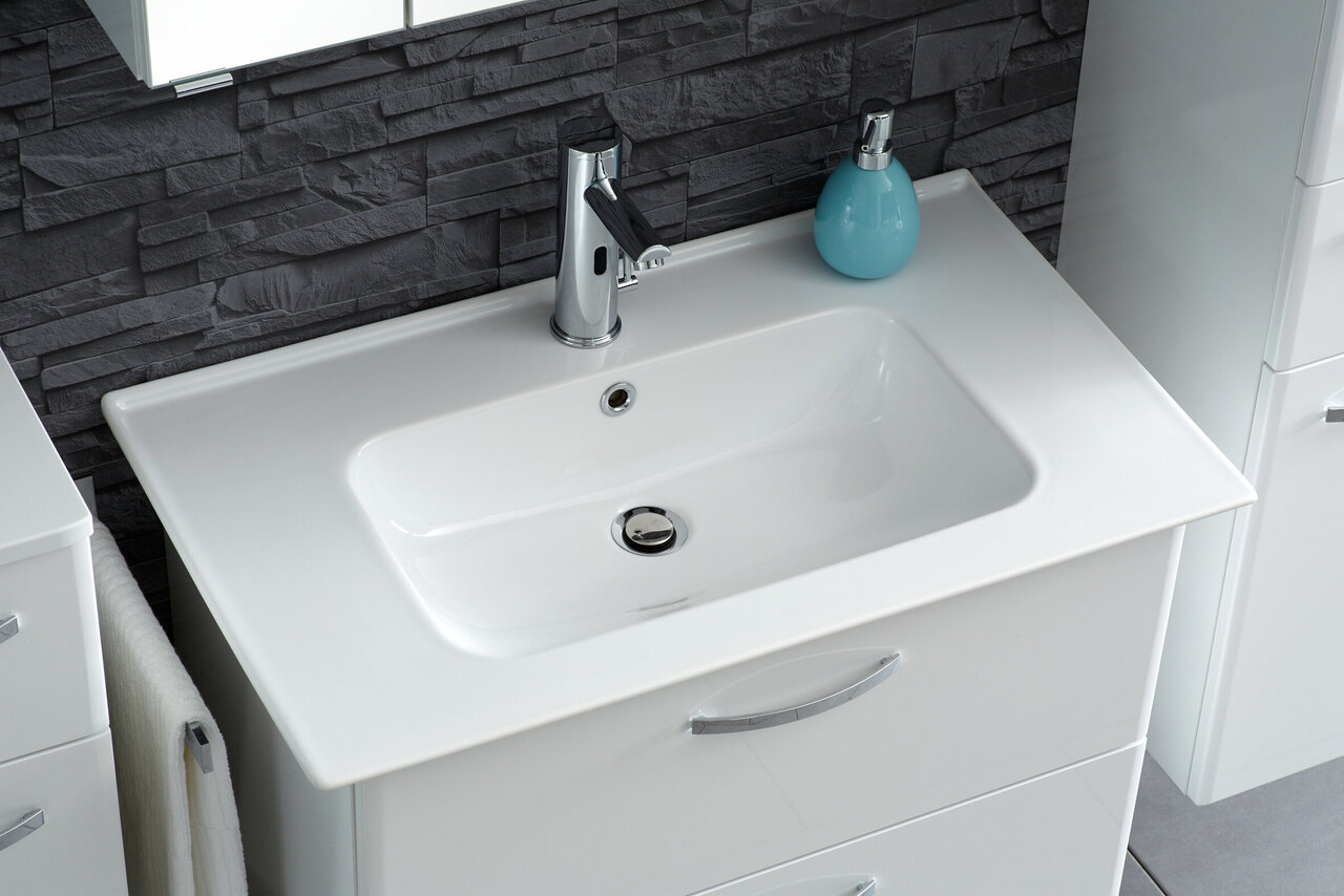 Frontdekor in Weiß Hochglanz, Korpusdekor in Weiß Glanz, Keramikwaschtisch, Waschbeckenunterschrank, 2 Auszüge, Griff Chrom Glanz, Spiegelschrank mit Schalter/Steckdose und LED-Profil oben, Montage wandhängend