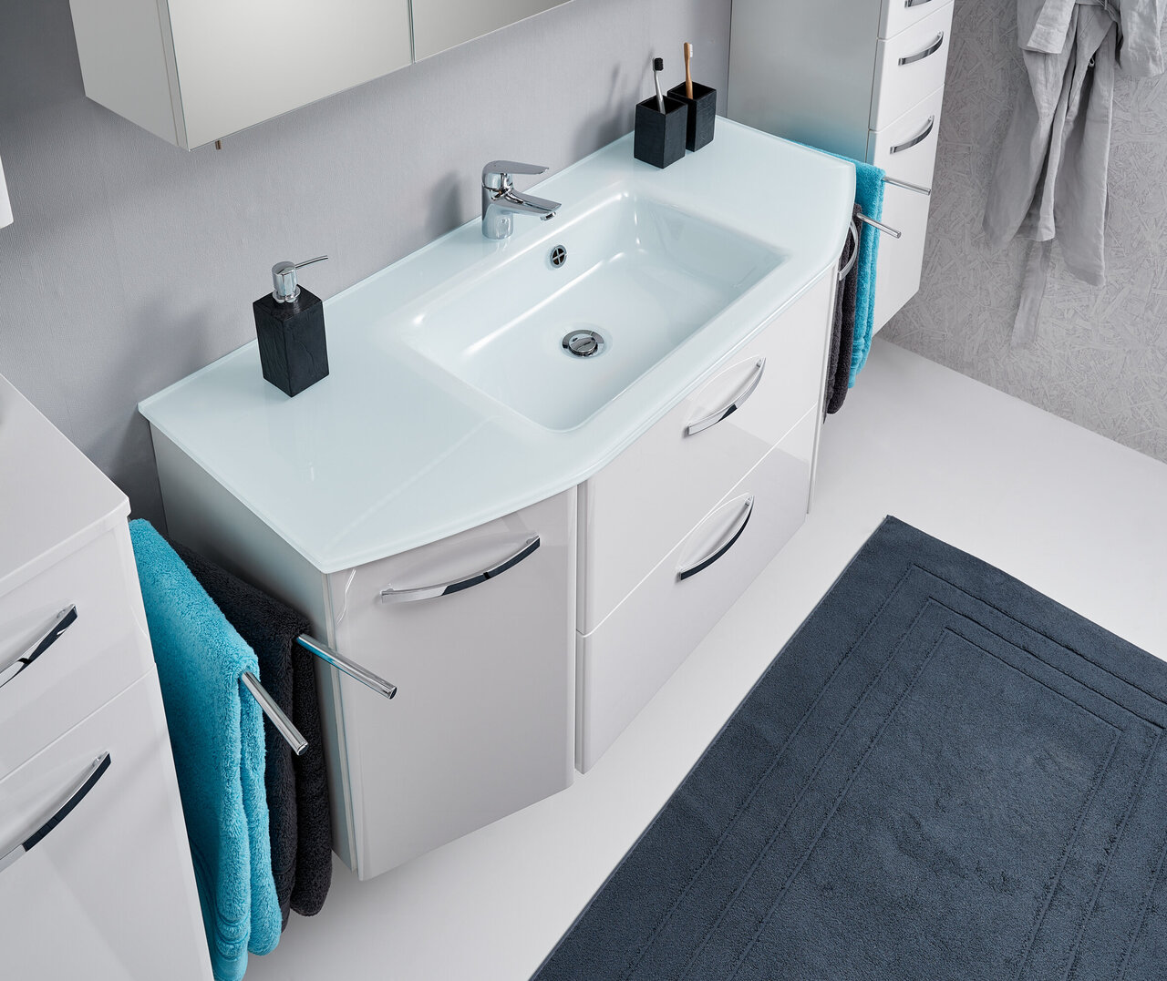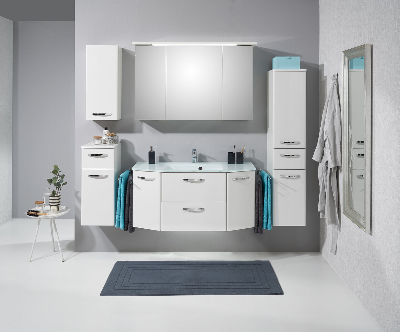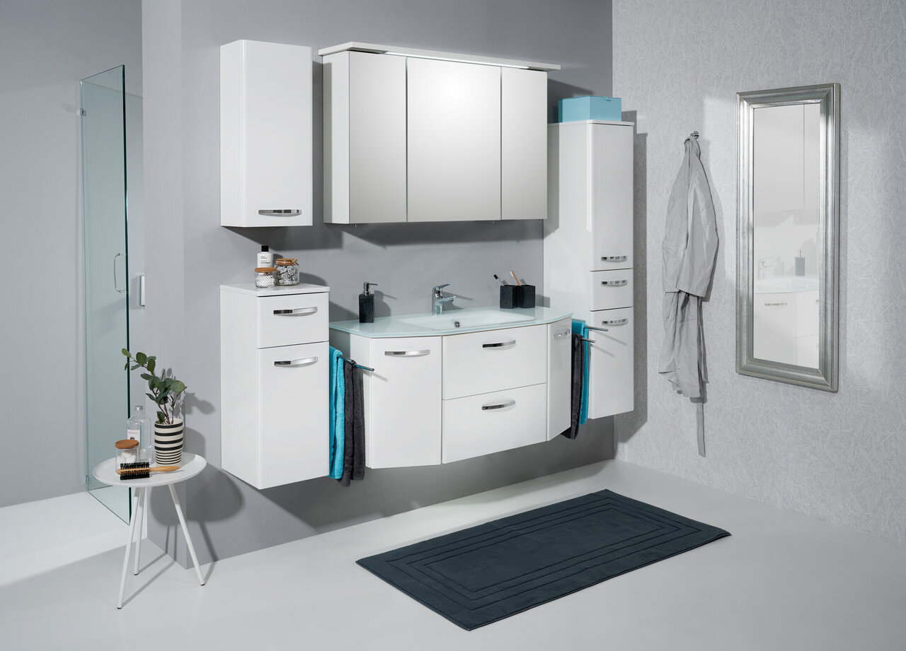 Frontdekor in Weiß Hochglanz, Korpusdekor in Weiß Glanz, Glaswaschtisch, Waschtischunterschrank, 2 Drehtüren, 1 Klappe, 1 Auszug, Griff Chrom Glanz, Spiegelschrank mit Schalter/Steckdose inkl. LED-Beleuchtung, Montage wandhängend