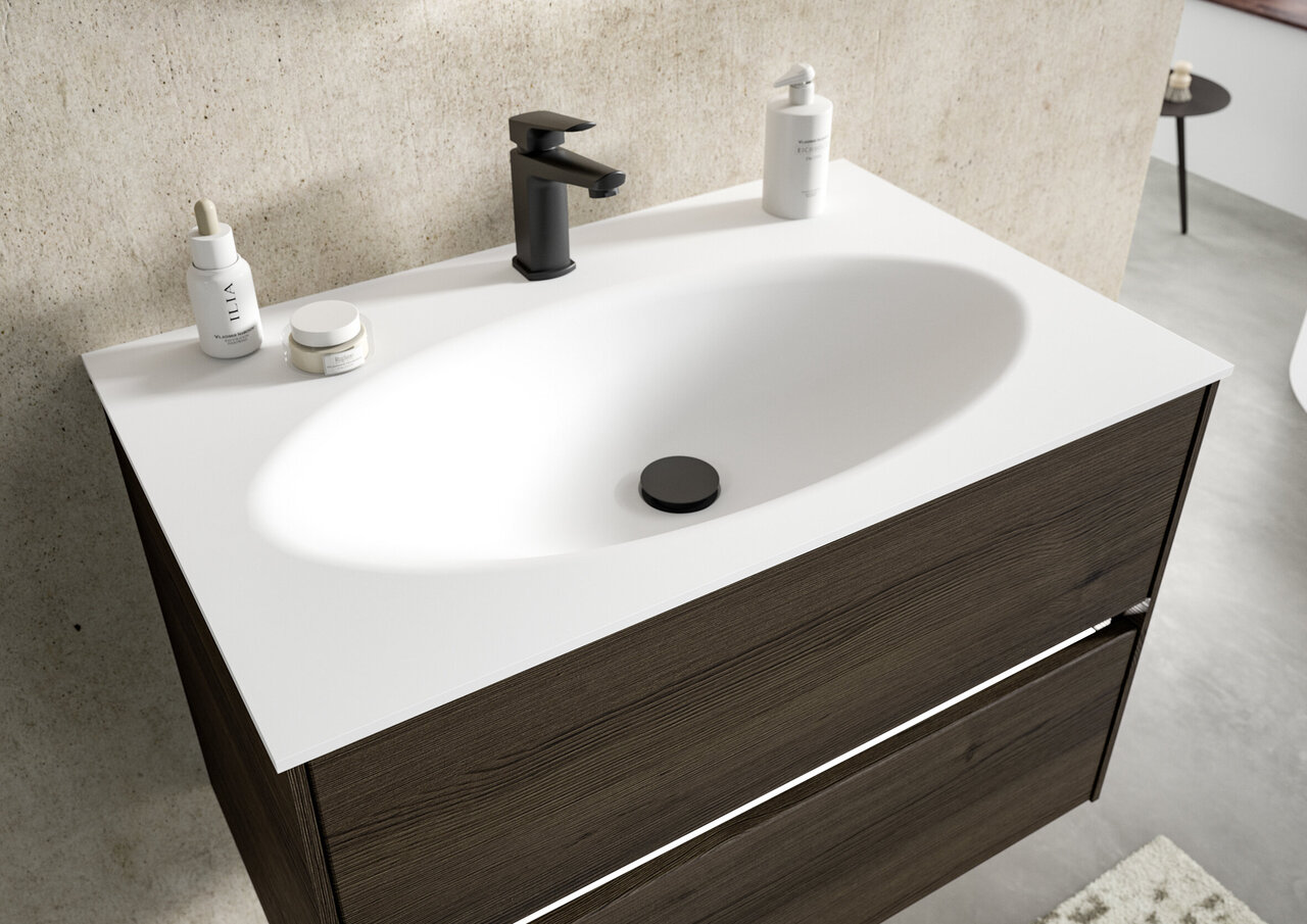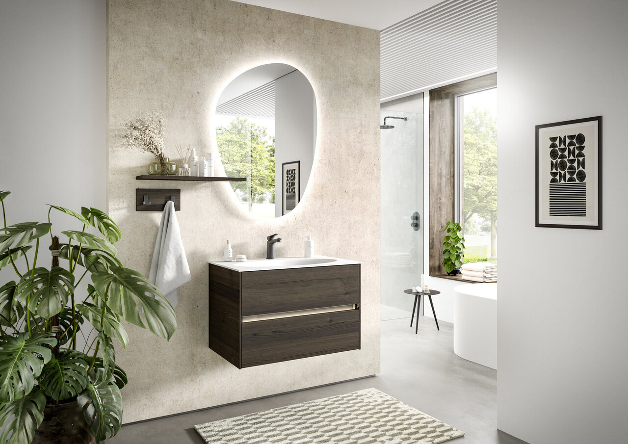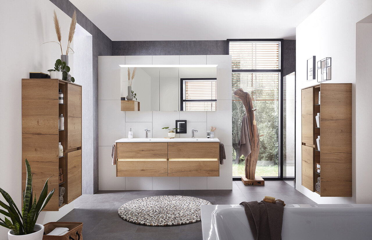 The SERIE 6010 range captivates with its straight lines and uncomplicated appearance. The intentional back-to-basics approach of these furnishings gives the range an air of clarity and a timeless character. The choice of whether to fit handles or not, as well as a diverse spectrum of possible combinations also offer the possibility to put your own personal stamp on the appearance of your furniture. As well as various wood finishes, matt and glossy laminated lacquer surfaces are also used, which offer a very unique haptic experience. An optional washbasin made of innovative Krion material provides a further highlight.