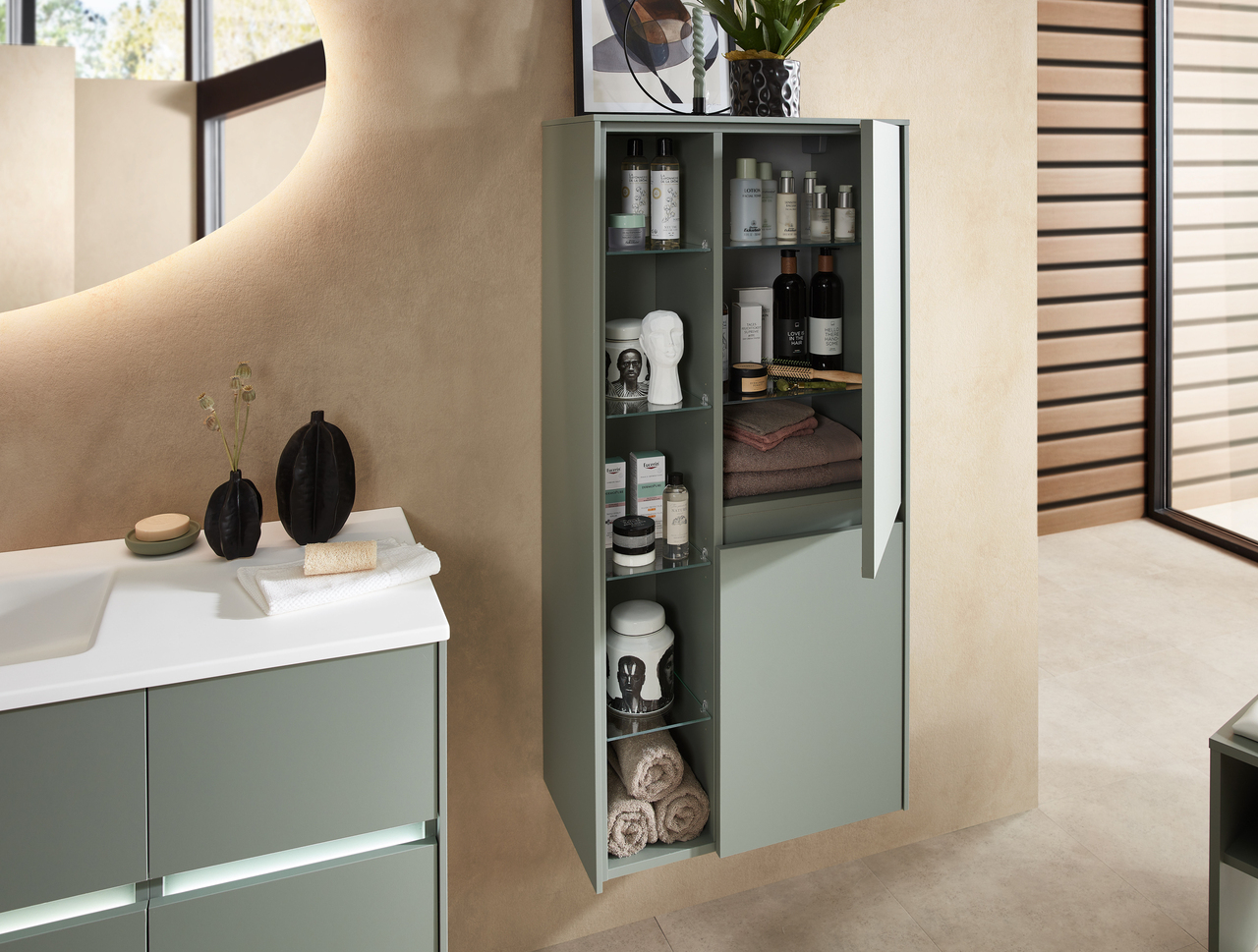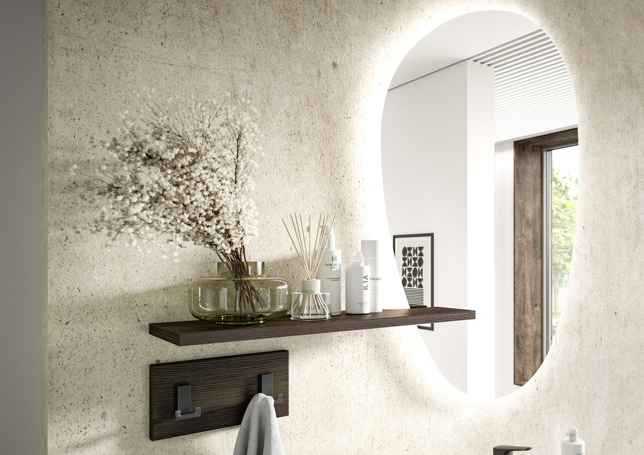 Our furniture is fitted with high-quality glass shelves. The washbasin vanity units are fitted with a shelf in carcass colour.