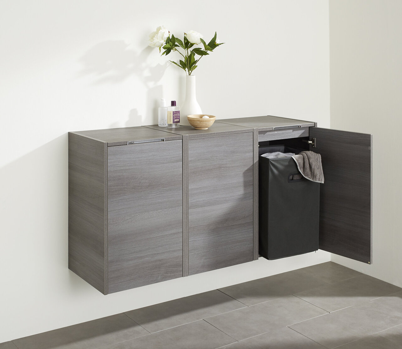 The all-metal quick-assembly hinges can be opened 107°. They are marked by their ease of installation and allow easy adjustment of the front panels. The tilt-out laundry hampers have special shears that lock automatically when opening.