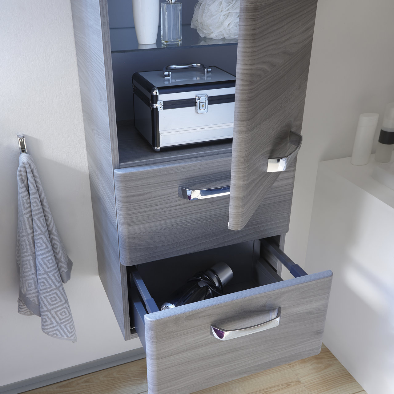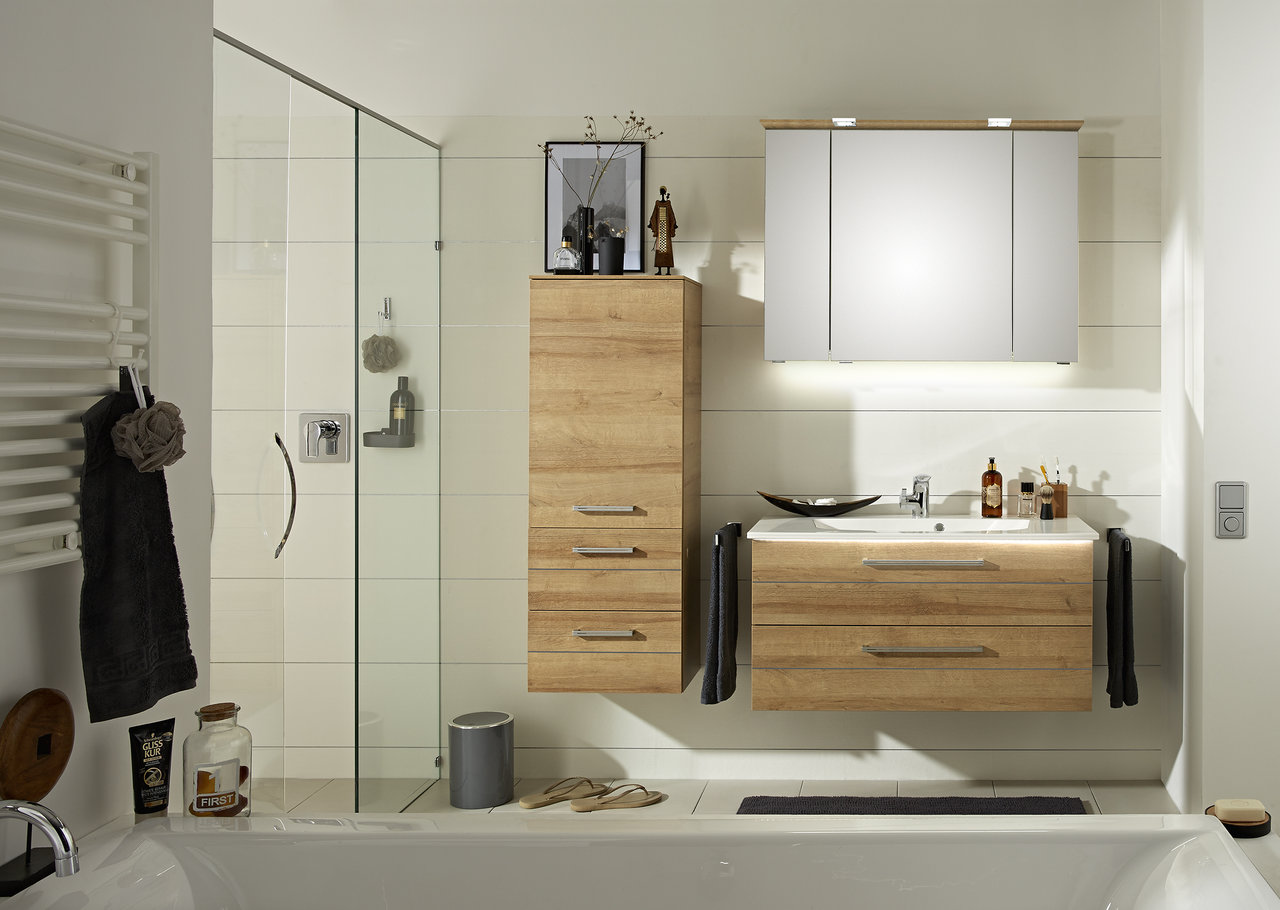 Universelle Beimöbel setzen Akzente im Badezimmer. Die verschiedenen Modelle warten mit funktionellen Features auf und bieten den Kunden eine große Auswahl, abgestimmt auf die individuellen Bedürfnisse. Dazu gehören Highboards, Wandschränke, Hoch- und Midischränke, die z. B. mit Wäscheklappen ausgestattet sind. In verschiedenen Dekorvarianten erhältlich, können sie optimal in das Ambiente integriert werden.