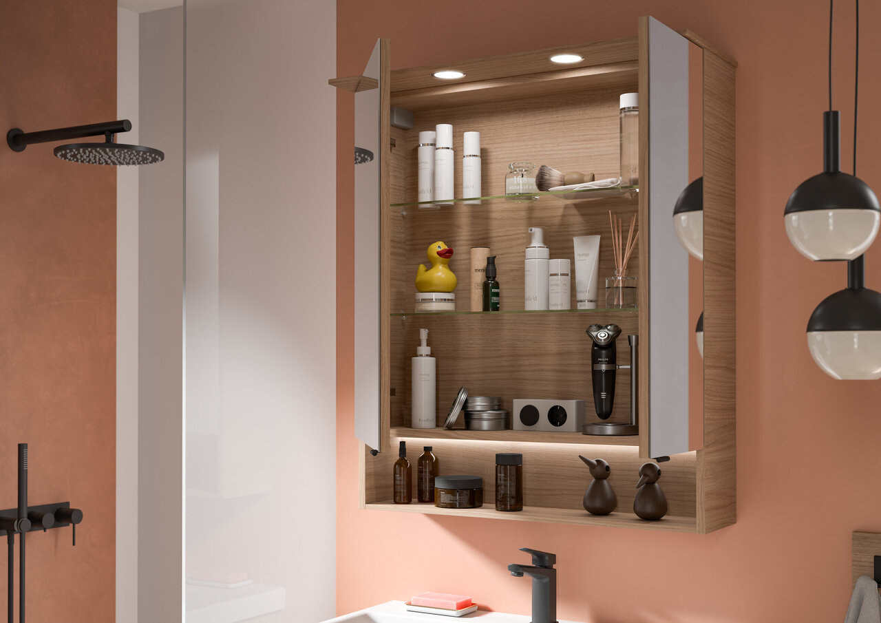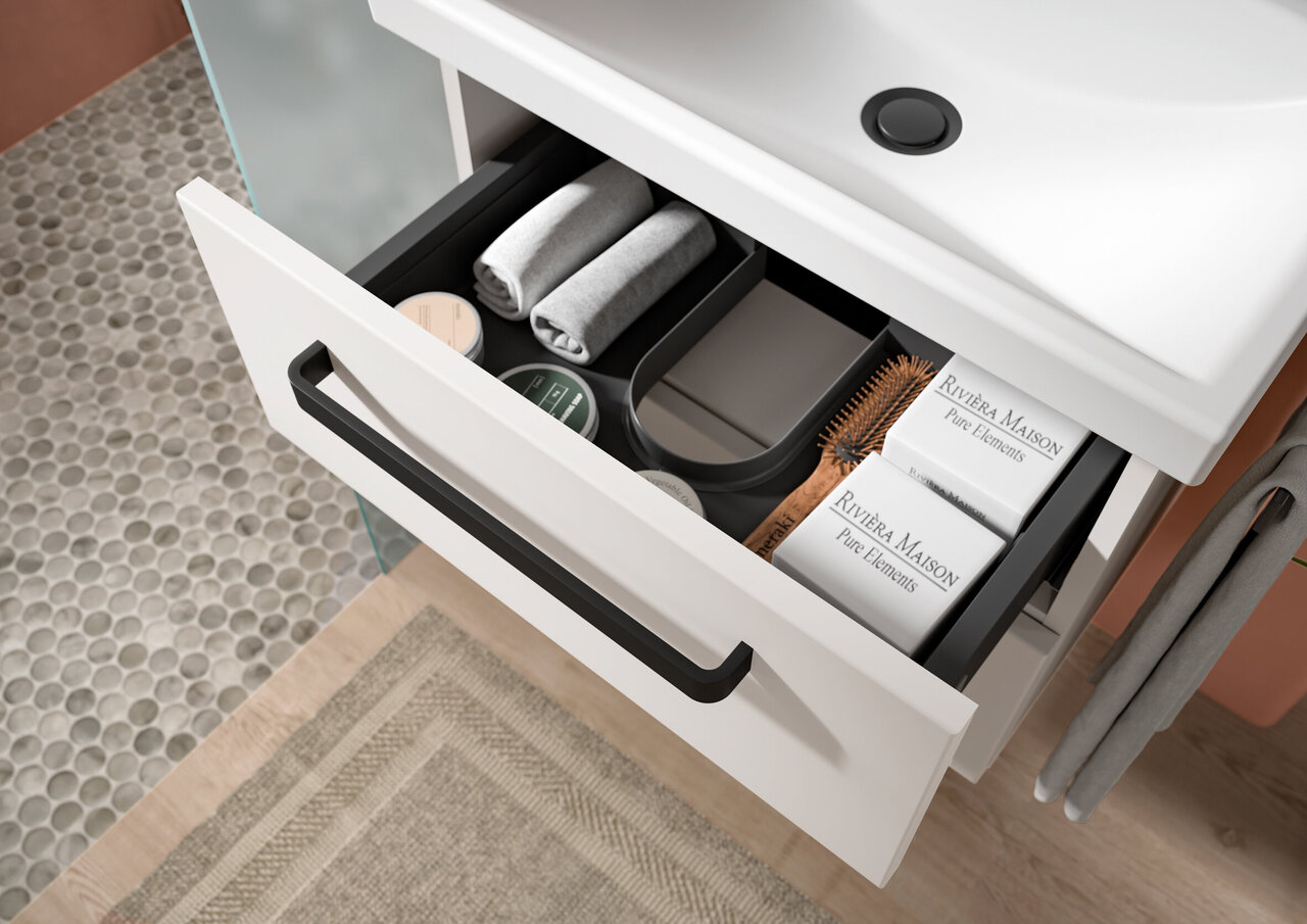 Our furniture is fitted with high-quality glass shelves. The washbasin vanity units are fitted with a shelf in carcass colour.