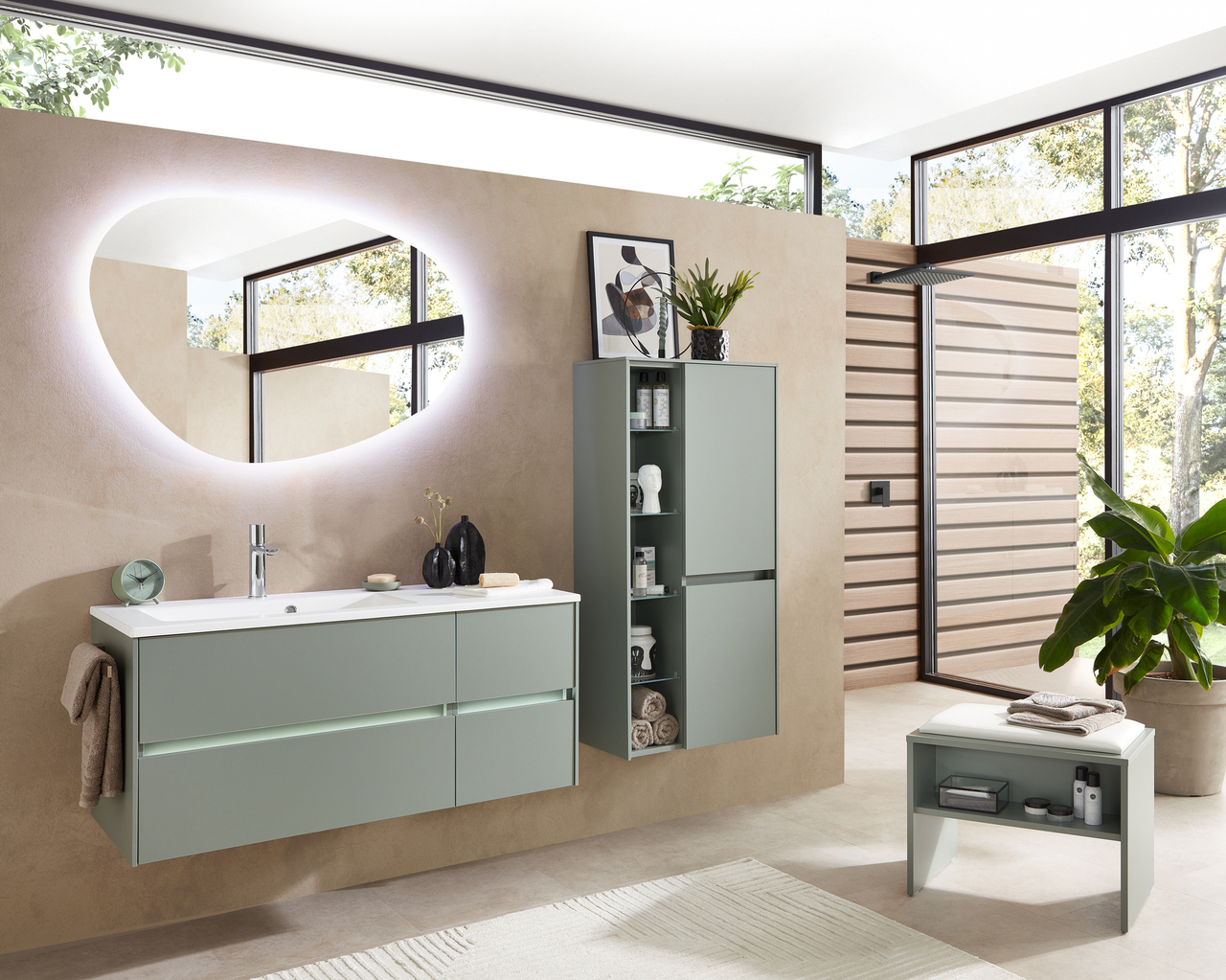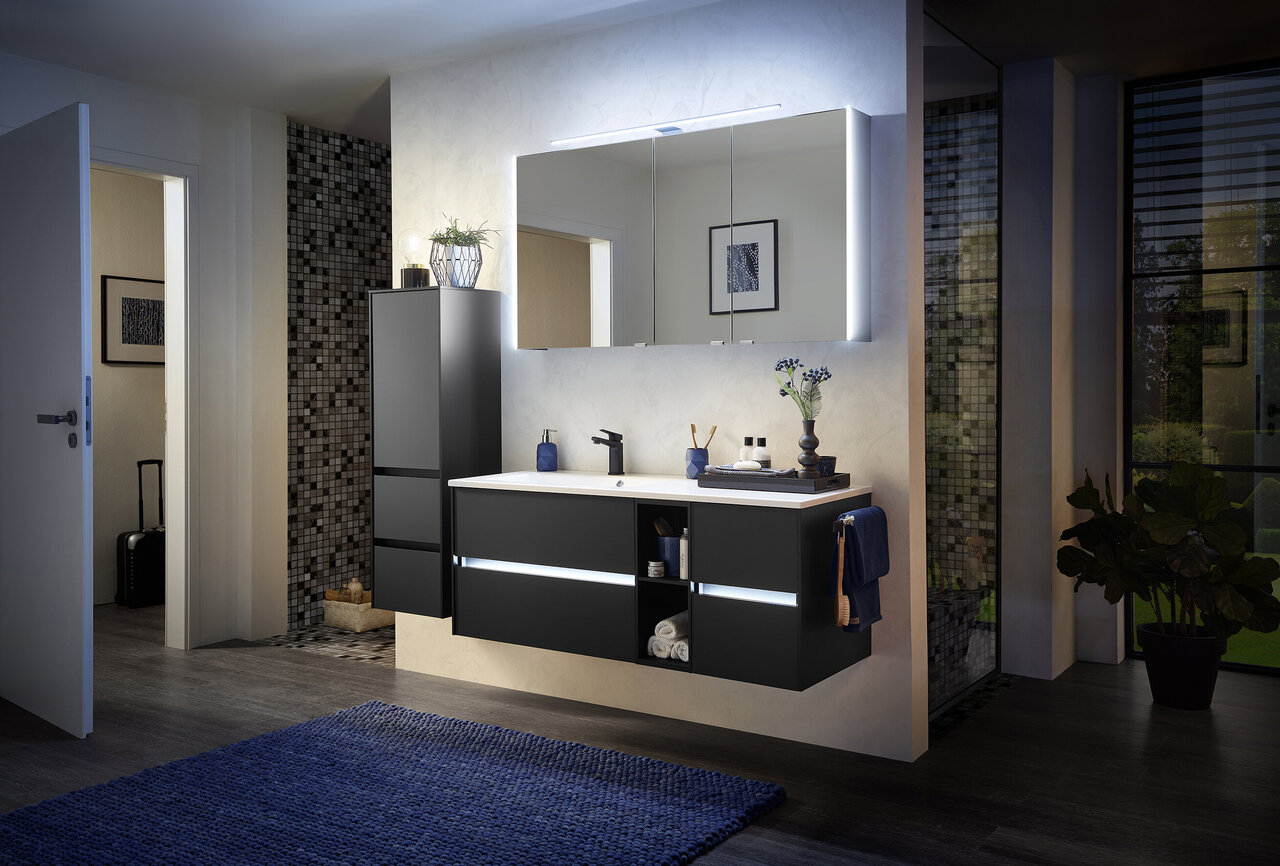 The SERIE 6010 range captivates with its straight lines and uncomplicated appearance. The intentional back-to-basics approach of these furnishings gives the range an air of clarity and a timeless character. The choice of whether to fit handles or not, as well as a diverse spectrum of possible combinations also offer the possibility to put your own personal stamp on the appearance of your furniture. As well as various wood finishes, matt and glossy laminated lacquer surfaces are also used, which offer a very unique haptic experience. An optional washbasin made of innovative Krion material provides a further highlight.